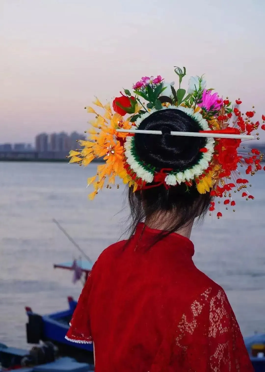 蟳埔女是我国三大渔女之一,是泉州丰泽蟳埔村渔女的称呼,至今仍保留着头戴簪花围的风俗。蟳埔女自打孩提时期,便将头发留长,系上红绳,穿上骨髻,插上发钗,另用鲜花串成花环,圈戴在脑后,如花园般鲜艳芬芳。