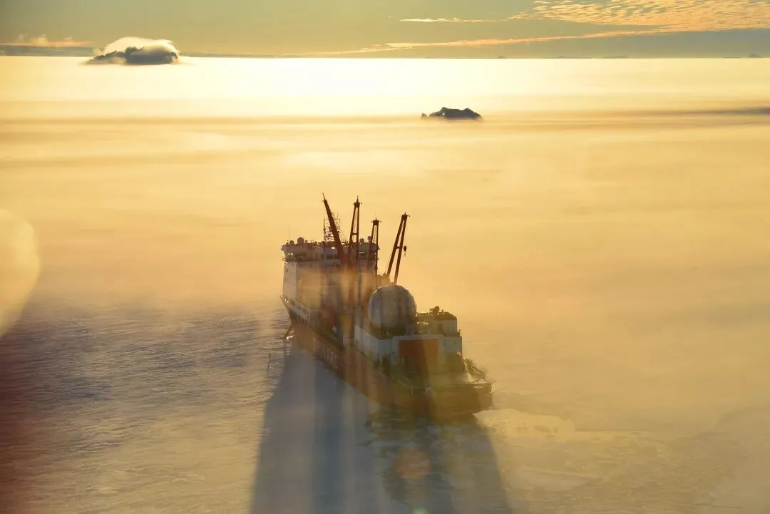 2018年1月3日,“雪龙”船行驶在雾气缭绕的南极海冰中。新华社发(杨佃良 摄)