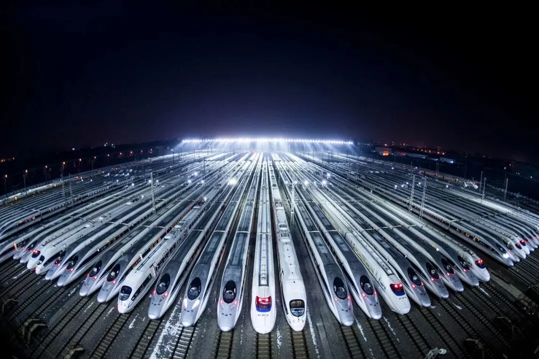 2018年2月1日凌晨,动车组列车停靠在武汉动车段的存车线上,准备进行检修和保温作业。新华社记者 肖艺九 摄