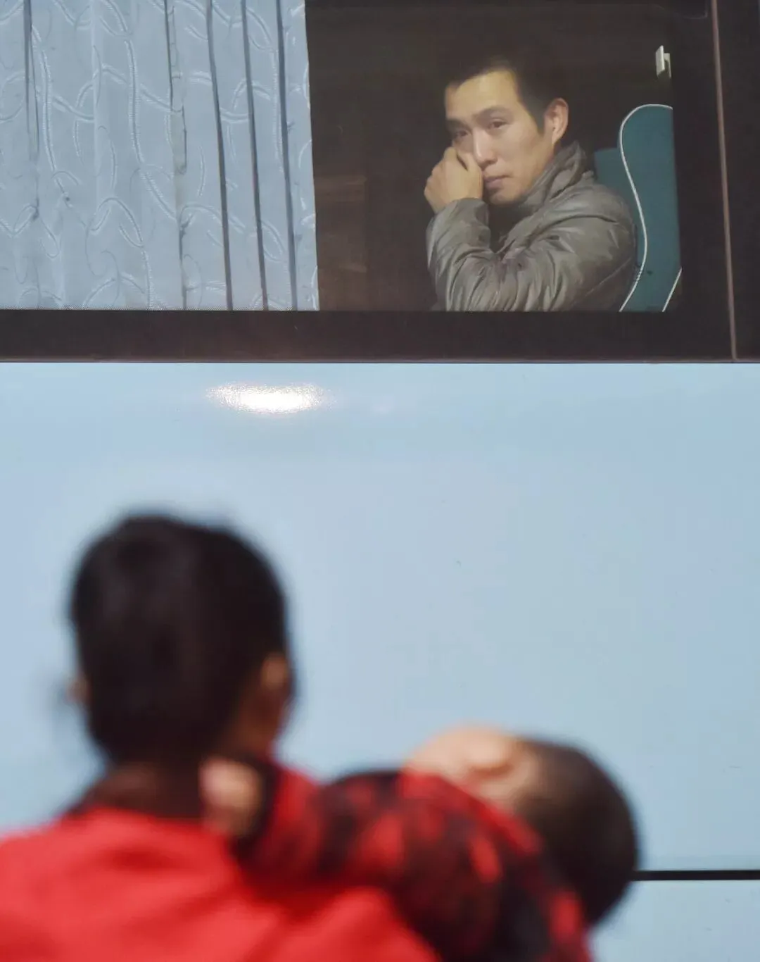2018年2月2日,长途车上的黄海龙看着哭闹的小儿子聪聪,用手擦着眼泪。老家在四川遂宁的黄海龙在福建石狮一家服装厂做缝纫工,为节省路费,多年未回老家过年的他暂别妻子和小儿子,独自返回四川陪留守在老家的父母和大儿子过年。新华社记者 宋为伟 摄