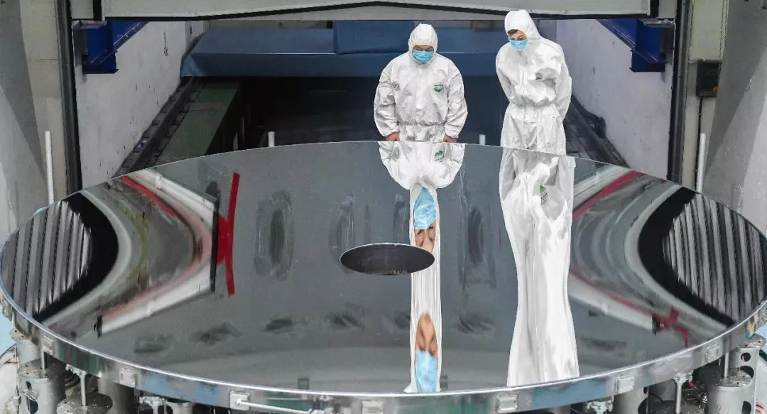 2018年8月21日,科研人员在检测塔检查4米量级高精度碳化硅非球面反射镜表面情况。新华社记者 许畅 摄