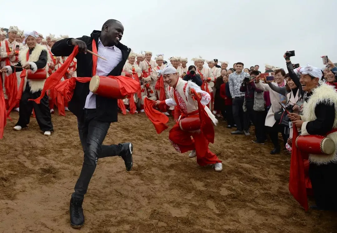 2018年10月20日,在陕西延安安塞区南沟进行的一场腰鼓演出结束后,一名外国游客与当地腰鼓手共同打起了腰鼓。新华社记者 刘潇