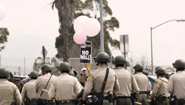 2018年3月13日,在美国加利福尼亚州圣迭戈市,一名男子在重重警戒中抗议设立美墨边境墙。当日,美国总统特朗普视察了位于该地的边境“样板墙”。新华社记者 李颖 摄