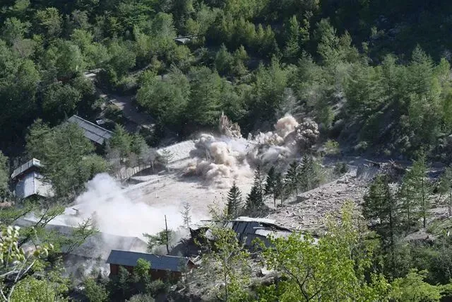 这是2018年5月24日朝鲜丰溪里核试验场内地面建筑爆破的场景。当日,朝鲜宣布正式废弃丰溪里核试验场。新华社记者 程大雨 摄