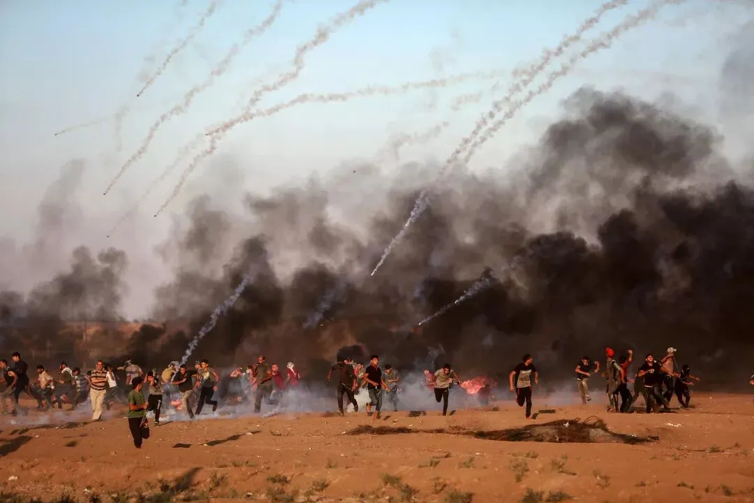 2018年8月10日,在加沙地带边境,巴勒斯坦人与以色列士兵冲突时躲避催泪瓦斯。新华社发