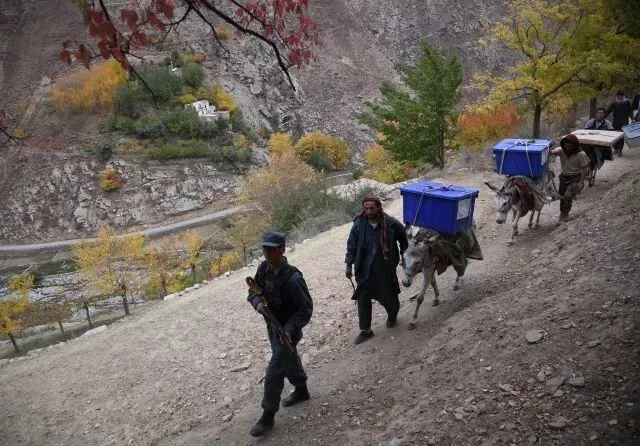 2018年10月19日,在阿富汗潘杰希尔省达拉地区,阿富汗独立选举委员会的工作人员用牲口运送国民议会人民院(下院)选举材料。新华社发 拉赫马特·阿里扎德 摄