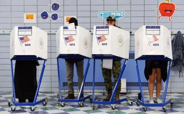 2018年11月6日,在美国纽约曼哈顿,选民在一处投票站填写选票。当日,美国迎来2018年中期选举投票日。新华社记者 李睿 摄