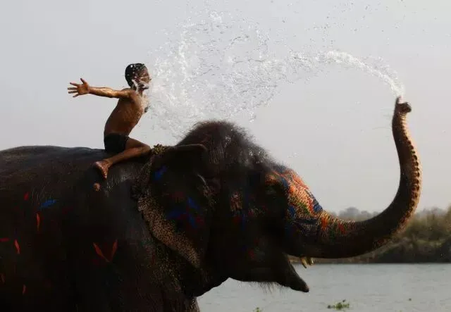2018年12月27日,在尼泊尔奇特旺,一名儿童在大象节上和大象戏水。新华社发 苏尼尔·夏尔马 摄