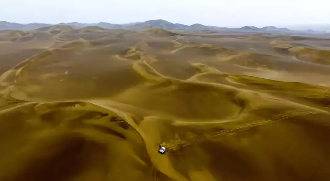 2018年6月4日,赛车在库木塔格沙漠腹地行驶。当日,2018中国环塔(国际)拉力赛在位于新疆鄯善县境内的库木塔格沙漠展开第二赛段角逐。赛段全长约297公里。 新华社记者 江文耀 摄