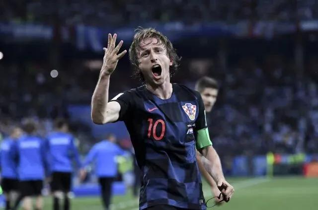 2018年6月21日,克罗地亚队球员莫德里奇进球后庆祝。当日,在下诺夫哥罗德进行的2018俄罗斯世界杯足球赛D组小组赛中,阿根廷队对阵克罗地亚队。新华社记者 李尕 摄