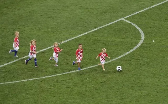 2018年7月11日,克罗地亚队球员的孩子在比赛后进入球场内。当日,在2018俄罗斯世界杯足球赛半决赛中,克罗地亚队与英格兰队在90分钟内战成1比1平。最终,克罗地亚队经过加时赛战胜英格兰队,历史上首次晋级世界杯决赛。新华社记者 王毓国 摄