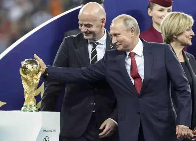 2018年7月15日,俄罗斯总统普京(前右)在颁奖仪式上抚摸大力神杯。当日,在莫斯科进行的2018俄罗斯世界杯足球赛决赛中,法国队以4比2战胜克罗地亚队,继1998年后再夺世界杯冠军。 新华社记者 费茂华 摄