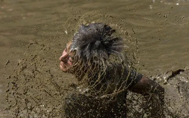 2018年8月26日,一名参赛者通过泥塘时甩去头发上的泥水。当日,加拿大多伦多举办2018年“泥地英雄”挑战赛。赛事设有6公里、10公里越野跑挑战赛,吸引了数千名参赛者。 新华社发 邹峥 摄