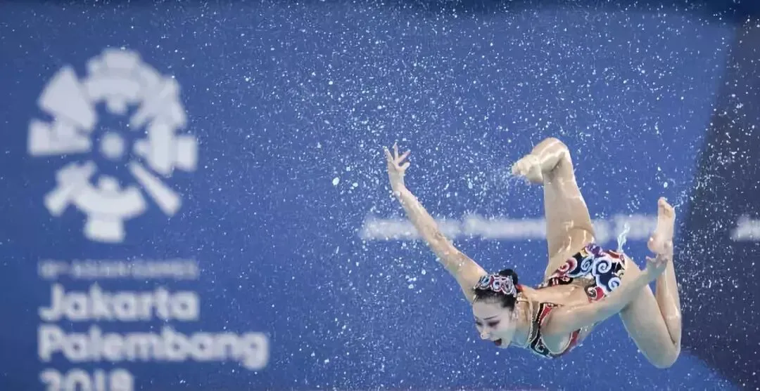 2018年8月29日,中国队选手在女子集体自由自选比赛中。当日,在第18届亚运会花样游泳集体项目中,中国队以186.9395分的成绩获得冠军。新华社记者 费茂华 摄