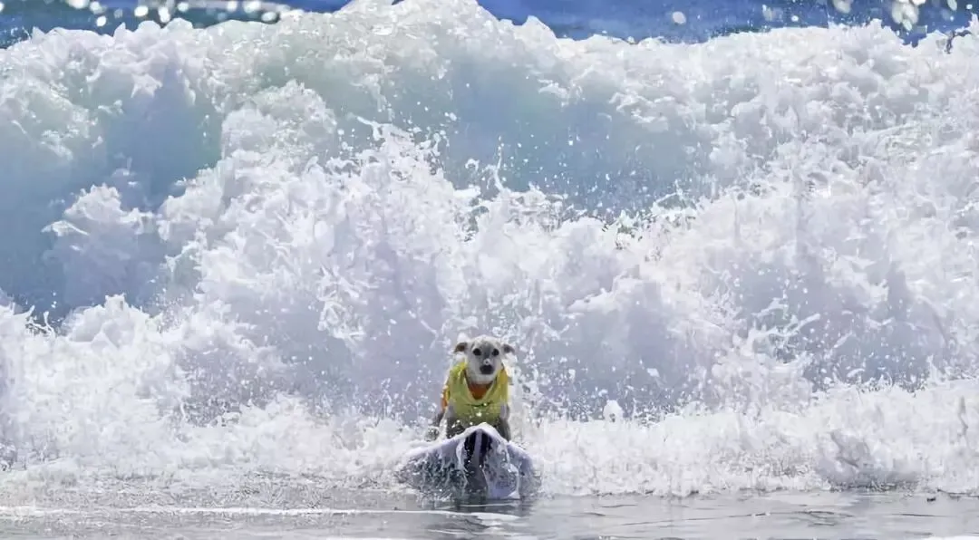 2018年9月29日,一只小狗在冲浪比赛中。当日,美国加州亨廷顿海滩举行狗狗冲浪大赛。狗狗们乘风破浪,“酷炫”十足。新华社记者 李颖 摄