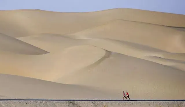2018年10月21日,选手在沙漠半程马拉松赛中。当日,为期三天的2018中国体育旅游露营大会(罗布人村寨站)在新疆维吾尔自治区巴音郭楞蒙古自治州尉犁县落幕,活动吸引了近千名来自全国各地的户外运动爱好者参加。新华社记者 陶希夷 摄