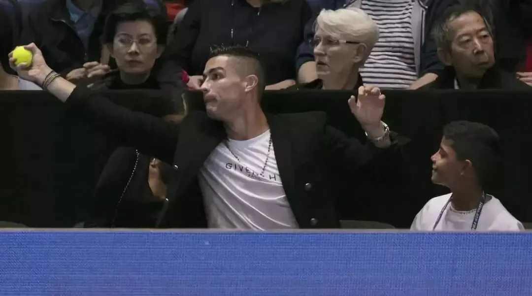 2018年11月12日,葡萄牙球星克·罗纳尔多(中)在场边抓住球员热身时飞出场的网球。当日,在英国伦敦进行的2018ATP世界巡回赛年终总决赛单打小组赛中,塞尔维亚选手焦科维奇以2比0战胜美国选手伊斯内尔。新华社记者 韩岩 摄