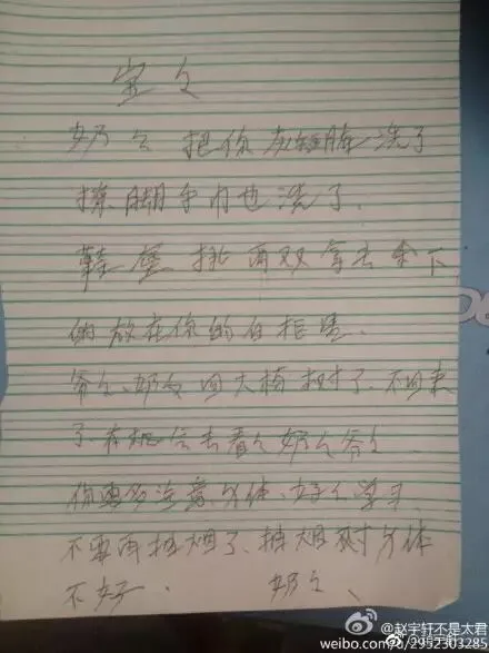 @趙宇軒____:打开笔记本,看见了奶奶给我留下的便条,有好多的错字,但是却那么温馨。2014年我出国回来了,奶奶却已经走了,回国后看见奶奶的照片,我哭得像个孩子……
