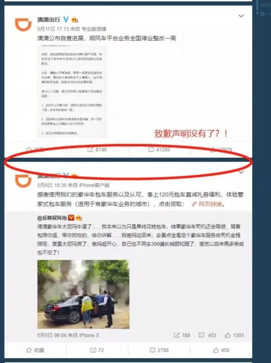 更令人难以置信的是,记者在滴滴出行的官方微博或是微信渠道查询5月10日空姐遇害案后滴滴的道歉声明,发现它竟悄然消失了。