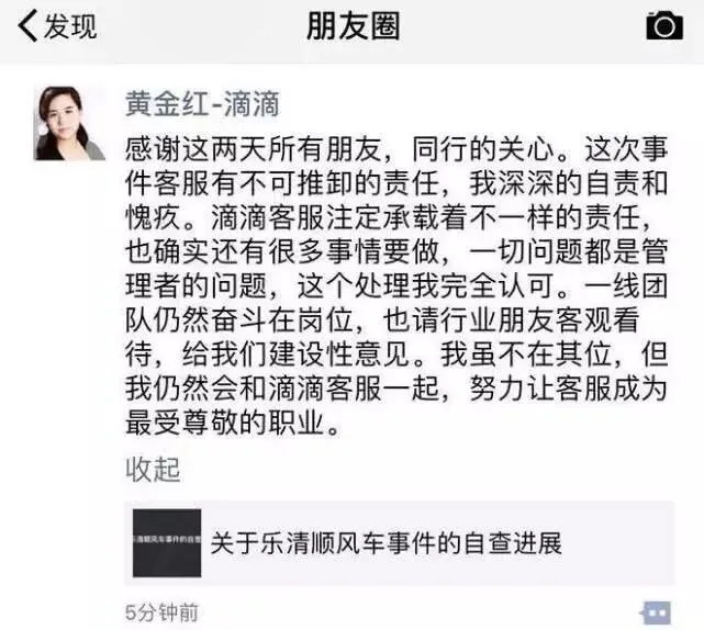 而滴滴客服承诺两小时回复但并未做到,也没有及时针对这一投诉进行调查处置。滴滴客服副总裁黄金红被“下课”后在朋友圈称:这次事件客服有不可推卸的责任。
