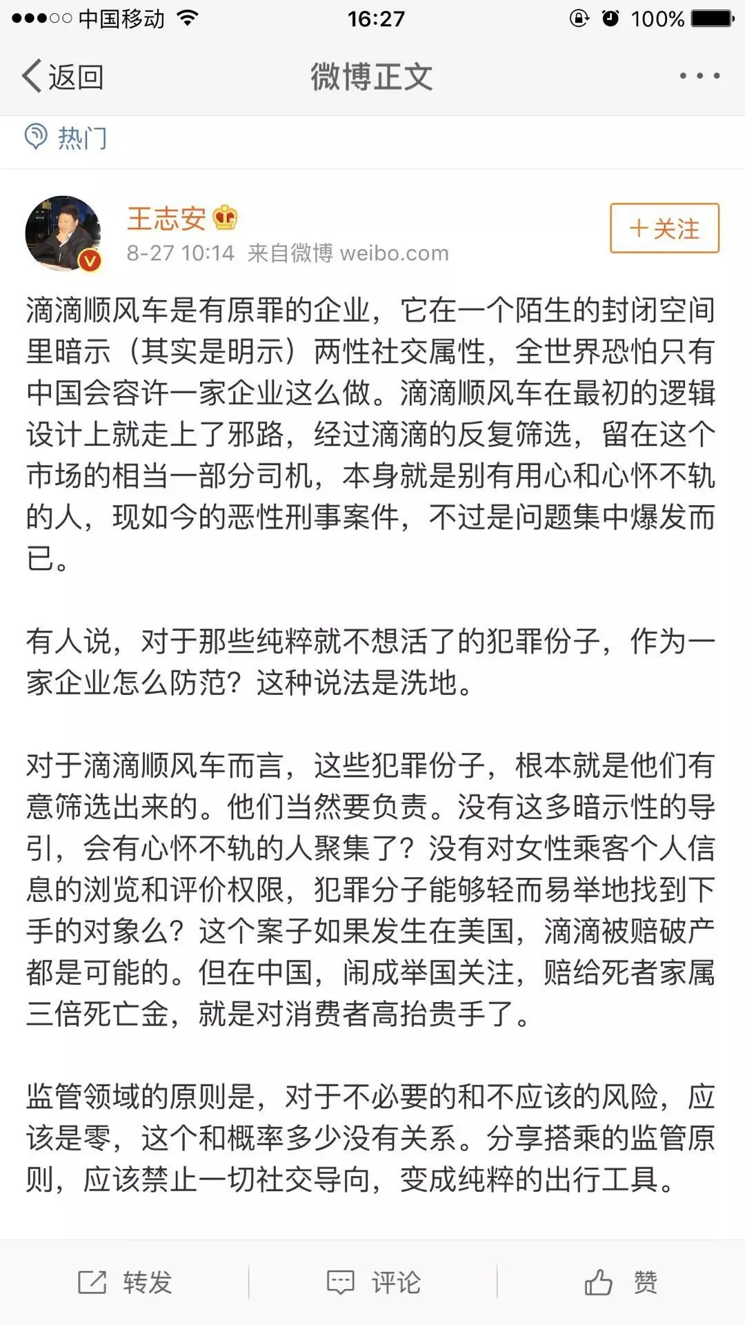 微博大V@王志安表示,滴滴顺风车是有原罪的,它在一个陌生的封闭空间里暗示(其实是明示)两性社交属性。