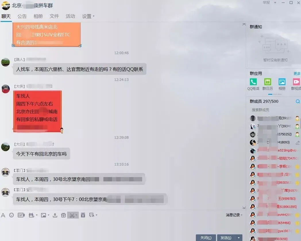 27日,某拼车QQ群内网友发出的部分拼车需求。截图