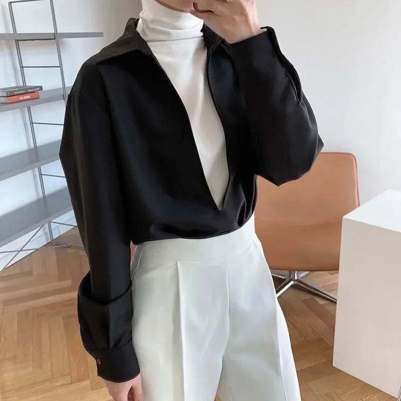 秋冬叠穿衬衫,白色搭配黑色,设计感小众长袖复古港风v领上衣灯芯绒衬衣外套 ,搭配牛仔裤阔腿裤,时髦必备神器啊!这么穿高级松弛感十足啦!