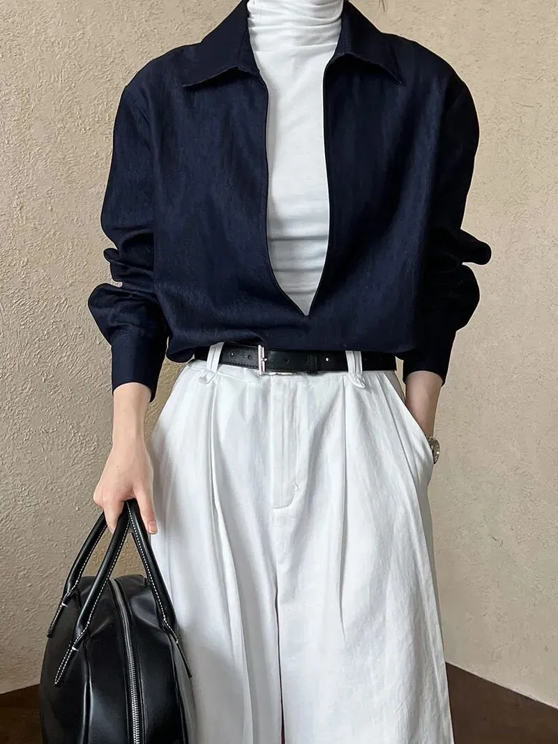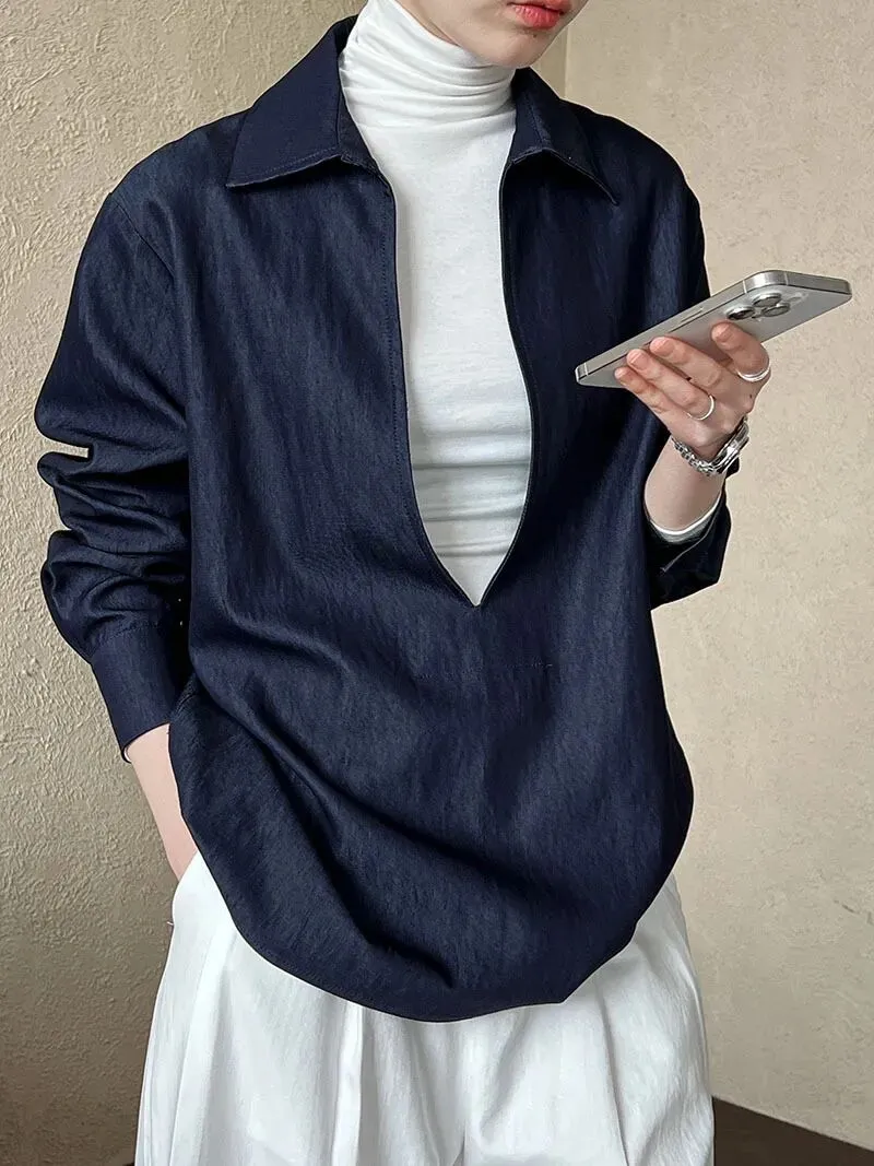 叠穿蓝色衬衫设计感,蓝色搭配黑色,小众港风春秋长袖复古港味法式领别致上衣 ,让你与众不同最可爱了。立春穿搭太美啦!开春穿搭,经典时髦必备单品!