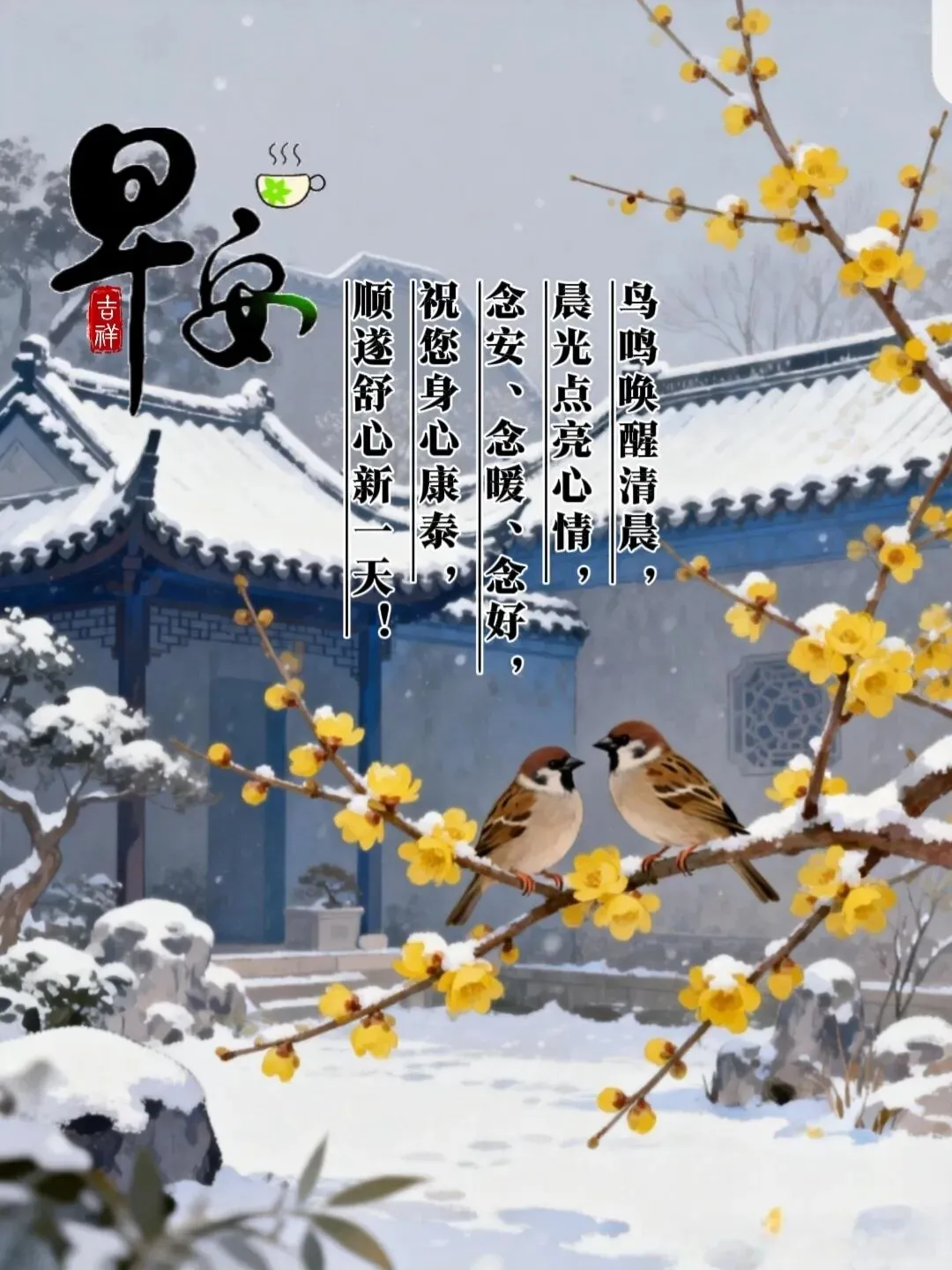 梅花像红裙姑娘,站枝头等。雪像撒落星子,落梅瓣上。风带梅香、带年味、带祝福,吹进窗——早安,梅开报春!