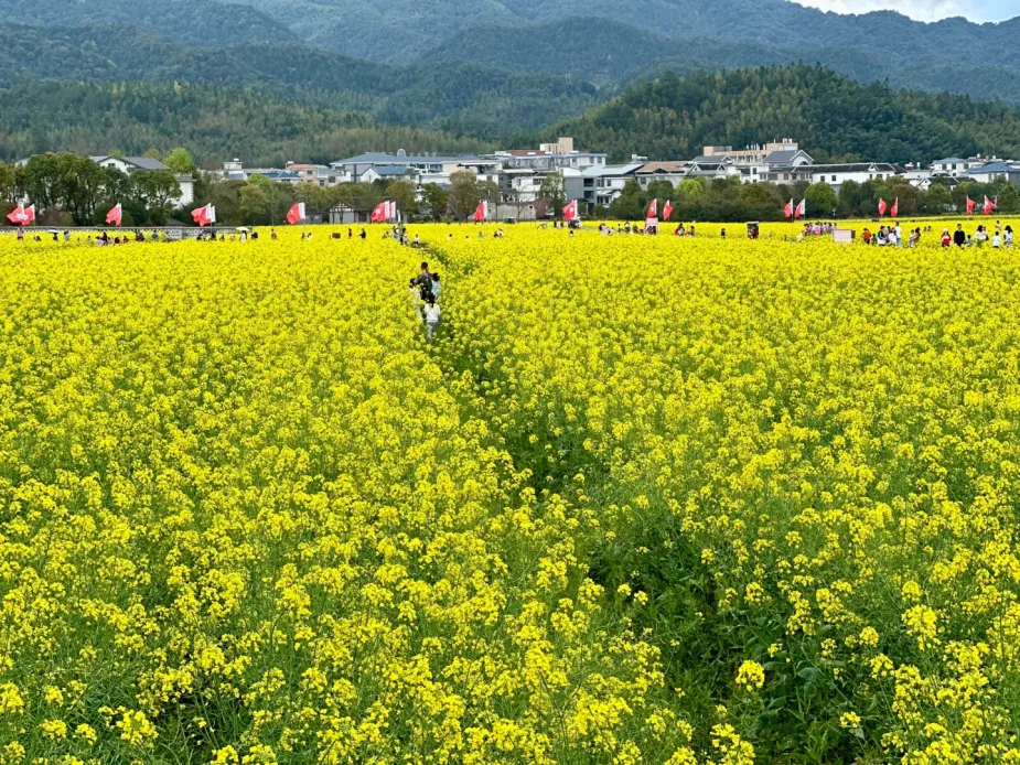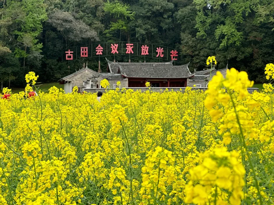千亩油菜花绽放古田会议会址,翠绿被金黄覆盖,微风拂过,春天特有的浪漫便从金色花海间翻涌而出。