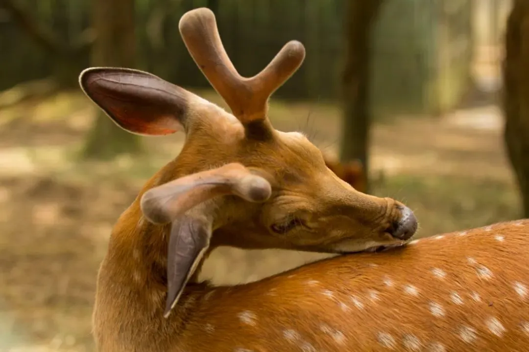 拾一把青草,喂食梅花鹿,观食草动物生活习性。