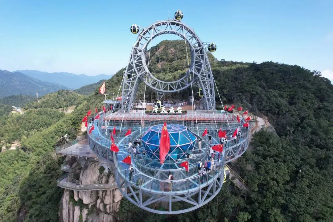 参观【摩天云台·悬挑玻璃平台】,项目位于海拔1388米梅花山虎园景区尖峰顶崖壁之上,项目为桁架悬挑结构,由悬挑玻璃平台、无轴摩天轮、空轨观缆车组成,悬挑玻璃平台长约52米,依山而悬,能全景观赏梅花山广阔的森林景观,远眺天宫山金佛;无轴摩天轮塔(如体验需自理)高约32米,有6个全景吊舱360°旋转观景;空轨观览车全长约180米,是隧道场景秀与空轨观览车相结合的游乐项目;三个项目创新一体,实现720°旋转观赏梅花山森林景观,带您遨游梅花山云海仙境,是景区云海、日出日落的最佳观景台。
