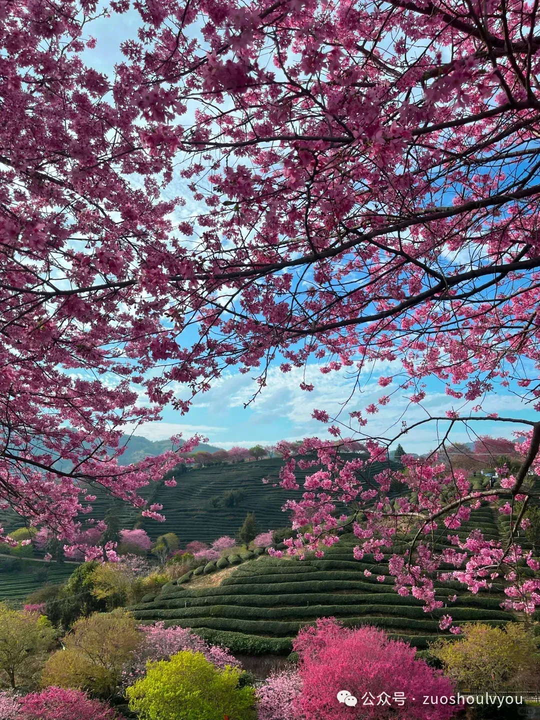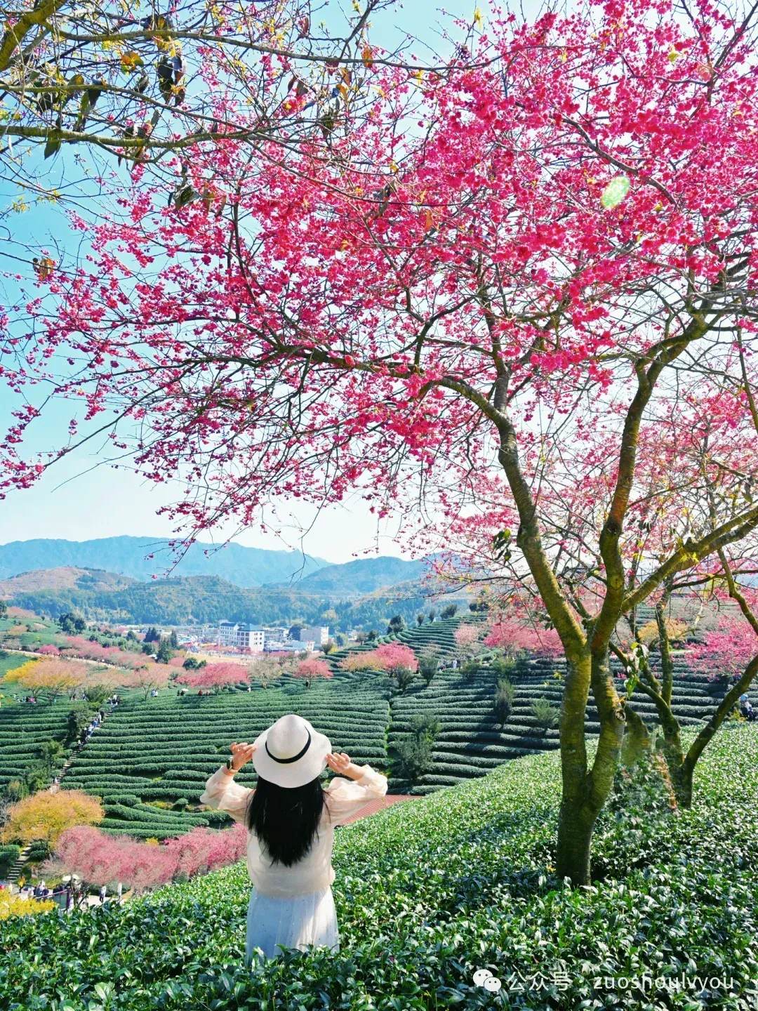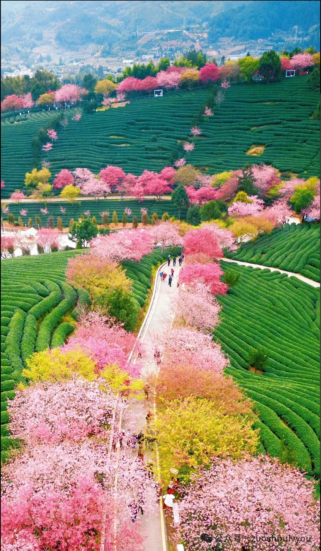 茶绿樱红!红色的樱花与满山碧绿的茶叶交相辉映,远远望去,依茶山走势种下的一棵棵盛放的樱花,像极了五线谱上跳动的音符,谱写着茶树与樱花相恋相守的浪漫乐章,茶园清新,樱花娇艳,景观美极了!