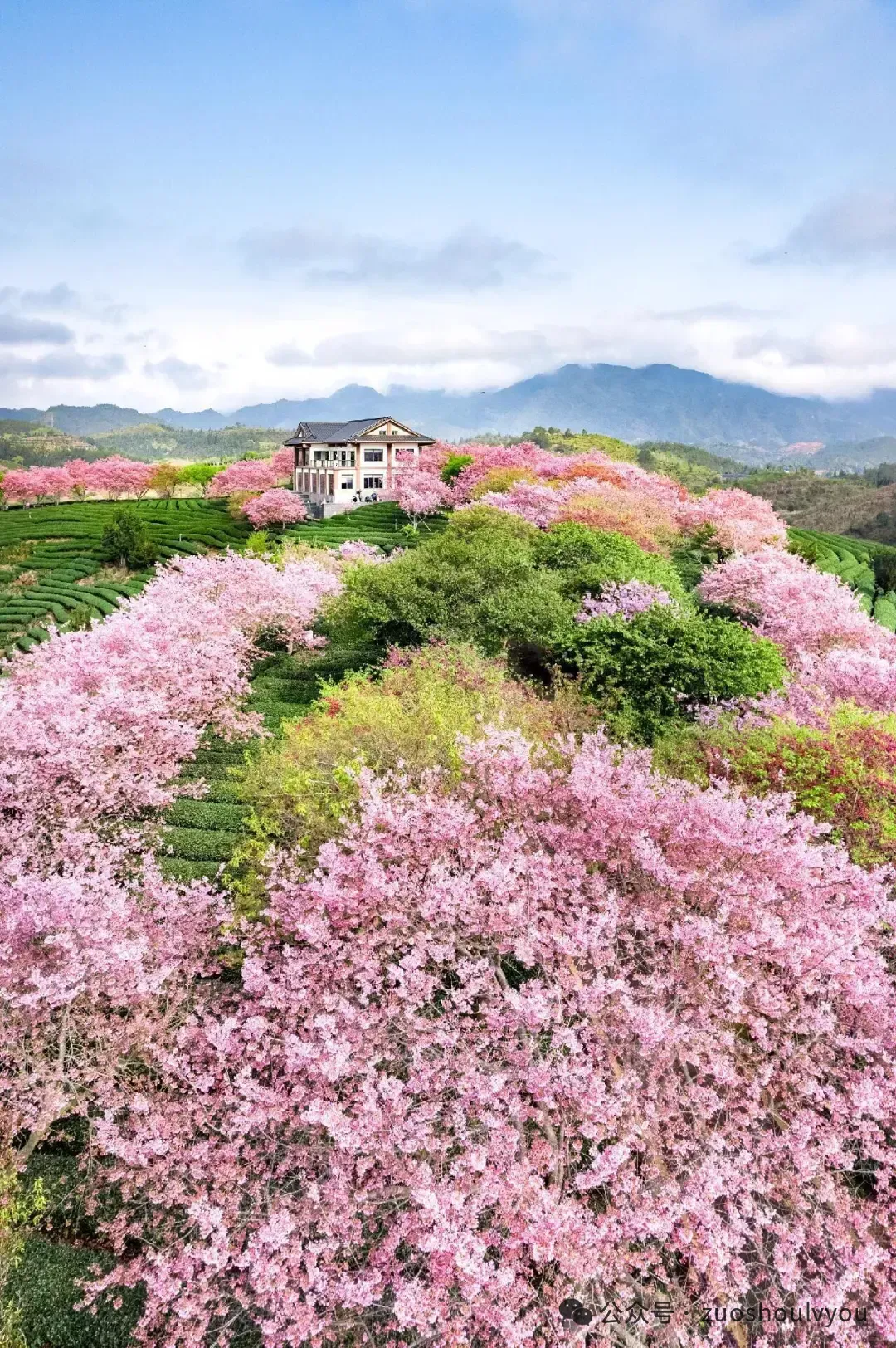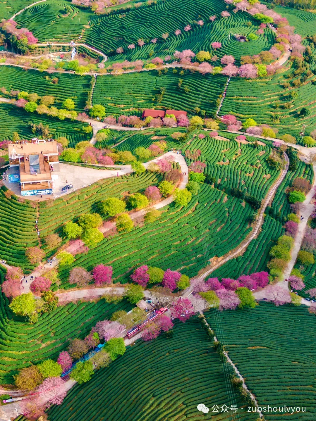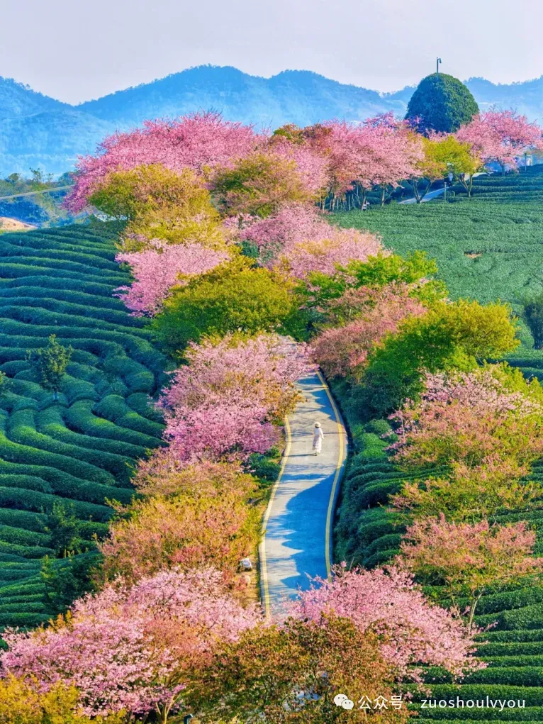 茶绿樱红!红色的樱花与满山碧绿的茶叶交相辉映,远远望去,依茶山走势种下的一棵棵盛放的樱花,像极了五线谱上跳动的音符,谱写着茶树与樱花相恋相守的浪漫乐章,茶园清新,樱花娇艳,景观美极了!