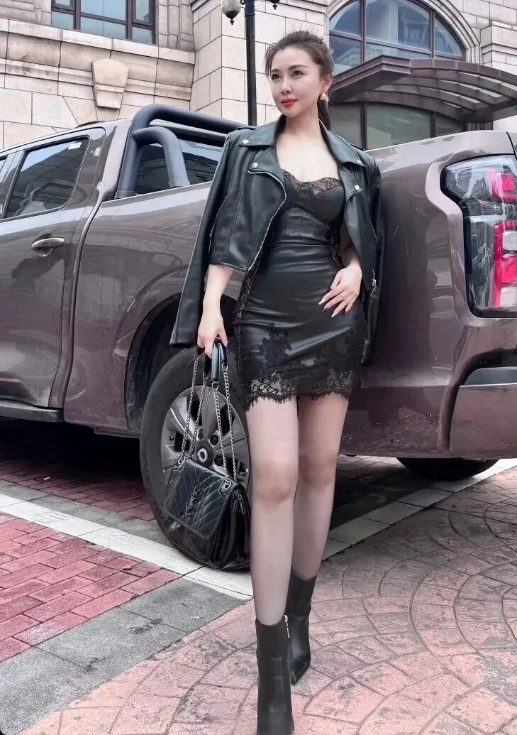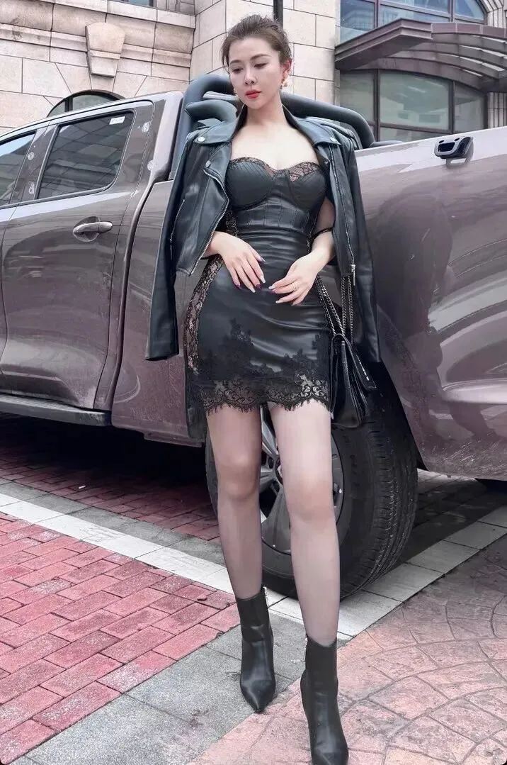.棕色皮卡.车旁边这.套look.真的.太有感觉.了。皮质抹.胸连衣裙搭.配短款皮.夹克.,又帅又.性感。裙子.是修身.的版型.,皮.质挺括有型.,抹.胸设计把肩.颈线条完.美展现.。短款机.车夹.克带着金.属拉链,酷.感十足。.配上黑.色丝袜和尖.头短靴,.整个人看起.来又高又.瘦。最后拎.一个黑色链.条包.,整.体造型层.次感十足.。这套跟闺.蜜逛街.或者去.音乐节都特.别合适,.回头率.绝对爆表.