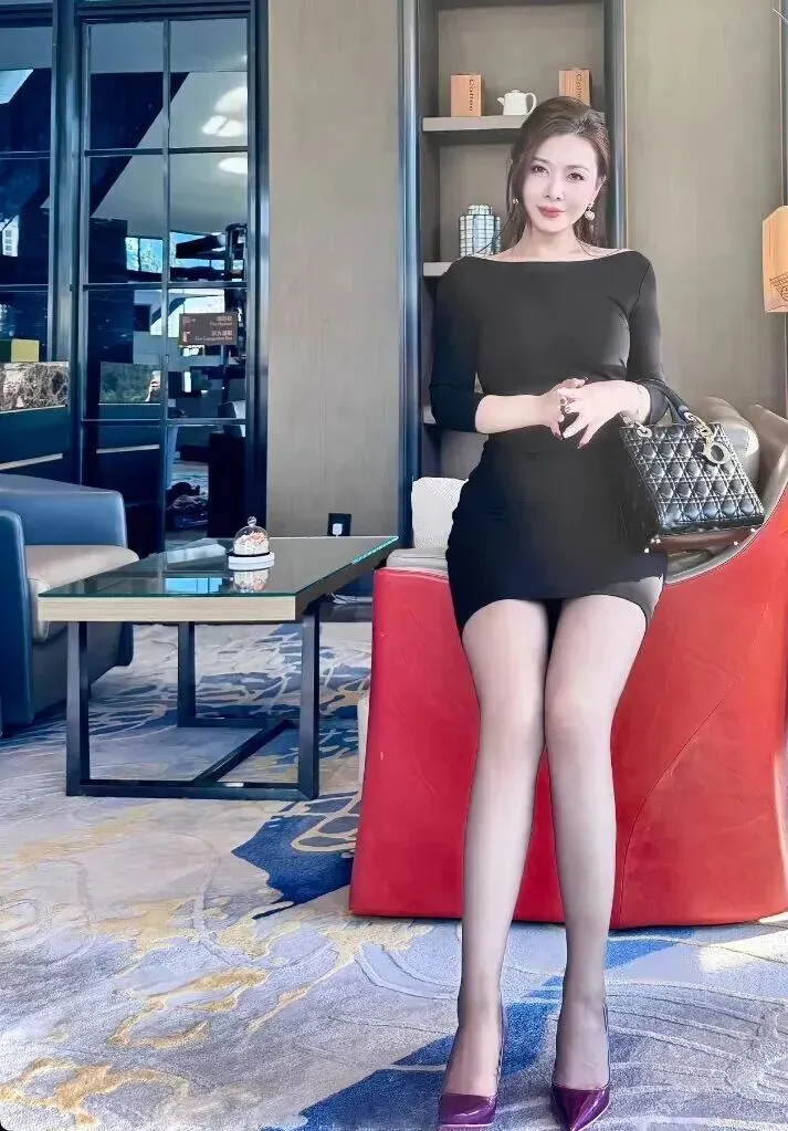 红色沙.发上的.这套也很.惊艳。黑色.包臀连衣.裙采.用弹力.面料,收腰.设计特.别显.腰细。裙.摆开叉.设计走路.时若隐若现.,特别有.韵味.。搭配肉.色丝袜和.紫色尖头.高跟.鞋,.紫色鞋.子给整体.造型带来.一抹亮色,.不会.显得.太沉闷.。配上黑色.菱格纹手提.包,.整体优雅又.时髦.