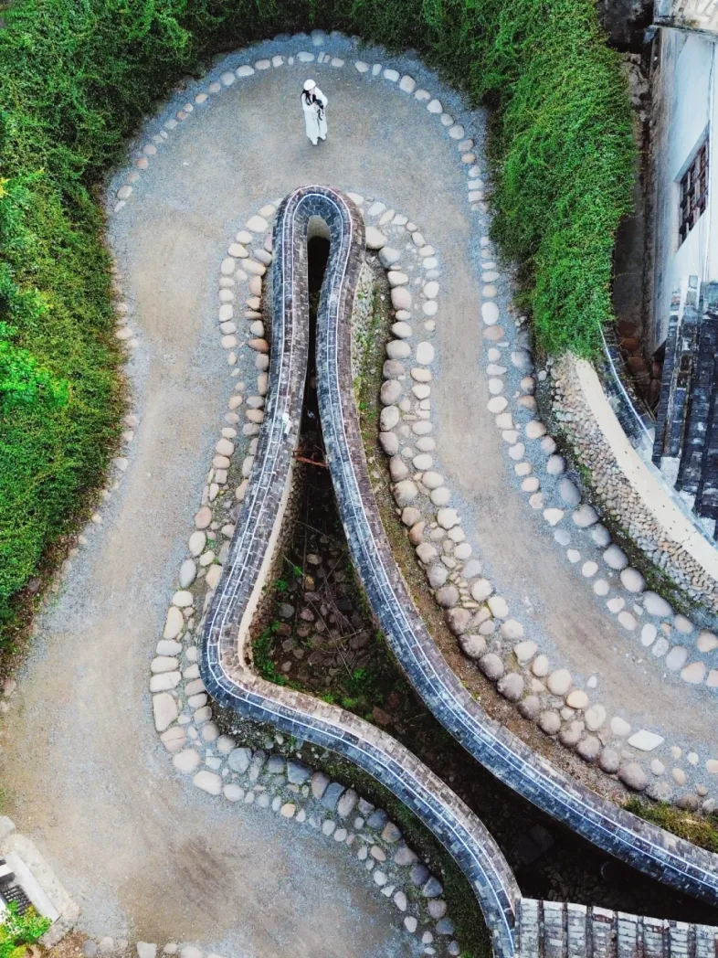 鹤形路是前往龙口古厝的通道,名字由来是取自仙鹤长寿吉祥的寓意。入口的书斋是鹤嘴,弯弯曲曲的小路象征着鹤颈,鹤颈有150米长,中间的土层是鹤的食道,两侧的墙基是由一粒粒的鹅卵石砌成相当于鹤吃的米,寓意着家乡的人们五谷丰登,不愁吃喝。