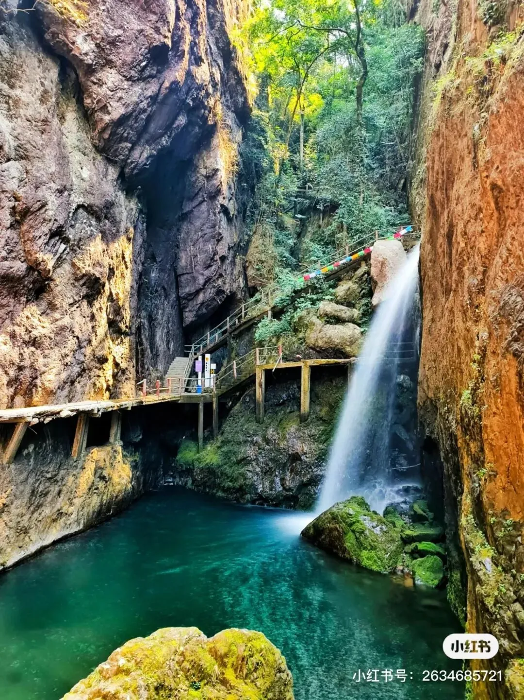 峡谷间,瀑布飞溅,清凉异常,深深吸一口进去,满是自然清新的味道。