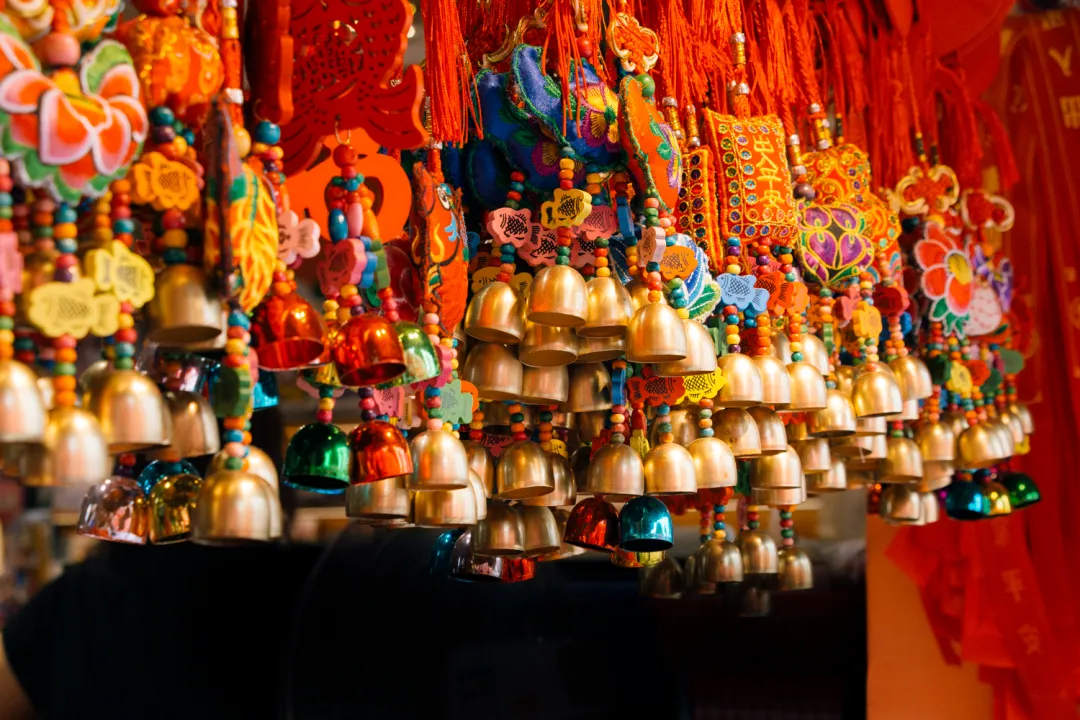 商铺里铃铛挂得满满当当,在阳光的折射下,还泛出浅浅的金光。也许是因为铃铛的高颜值,所以不论走到哪个网红景点,都能有它的身影。