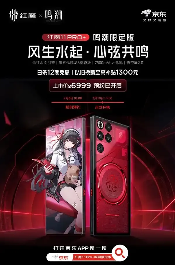 鸣潮玩家+数码党速集合!2月6日官方正式官宣王炸新品——红魔11 Pro+鸣潮限定版今日发布,主打《鸣潮》人气JK女神千咲主题,从外观到周边深度定制,核心规格16GB+512GB,定价6999元,将于2月10日10:00正式开售,堪称游戏党年度最值得冲的限定旗舰,颜值与性能双在线,懂的都懂这波情怀拉满!