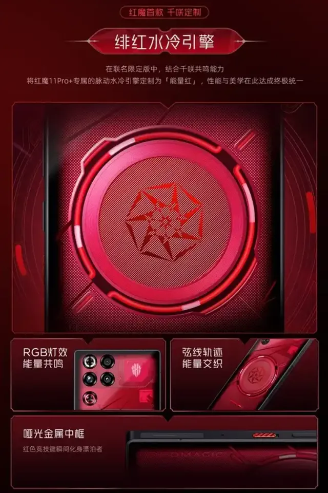 先看最吸睛的外观定制,每一处细节都藏着千咲的专属印记,质感直接拉满。机身采用千咲经典的猩红配色,搭配线条交织的红透玻璃背板,纳米级微蚀刻工艺打造的缎纹轨迹纹理,在不同光线下会呈现渐变光泽,高级感十足。更用心的是,红魔标志性的脉动水冷引擎,被定制为千咲专属绯红引擎,搭配能量共鸣元素的RGB灯效,开机瞬间灯效亮起,仿佛千咲的异能力即将激活,视觉冲击直接拉满。