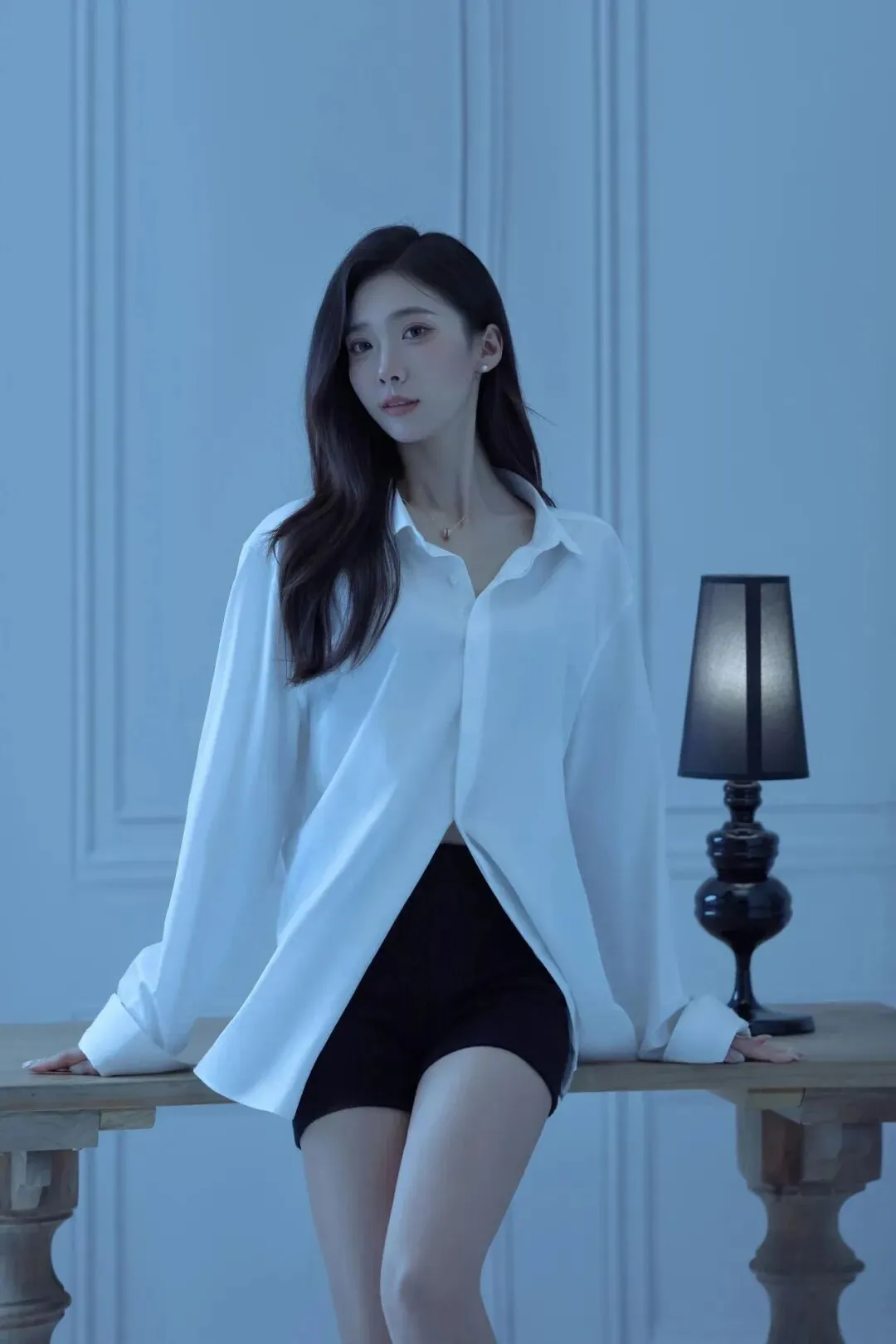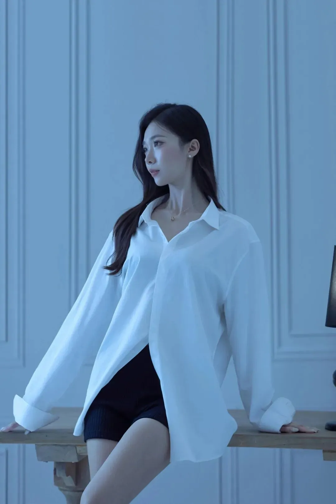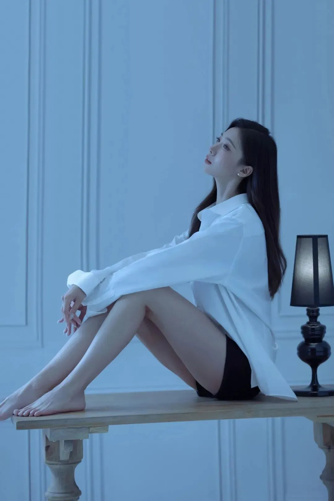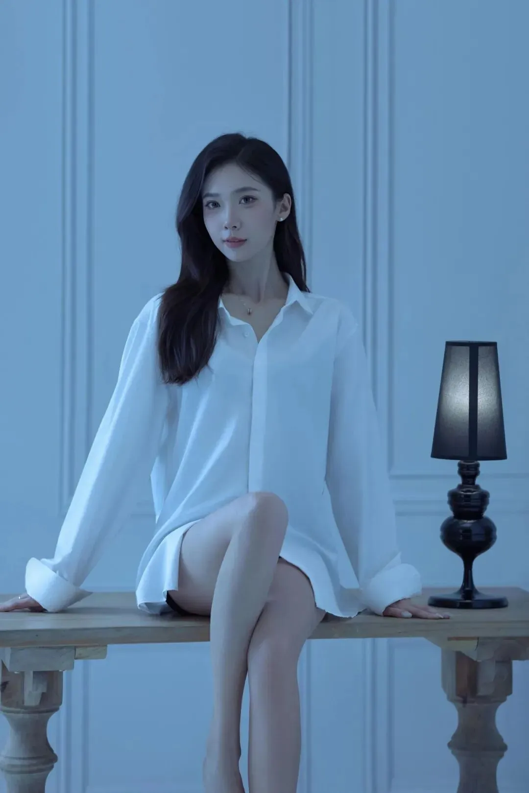侧身坐在木桌边缘,一条腿自然垂落、脚尖轻点地面,另一条腿屈膝搭在桌上,身体微微向后仰,抬头看向斜上方,像在静静听窗外的风声。冷调的漫射光从侧面铺过来,衬衫的垂坠感和腿部线条会被衬得很柔和。