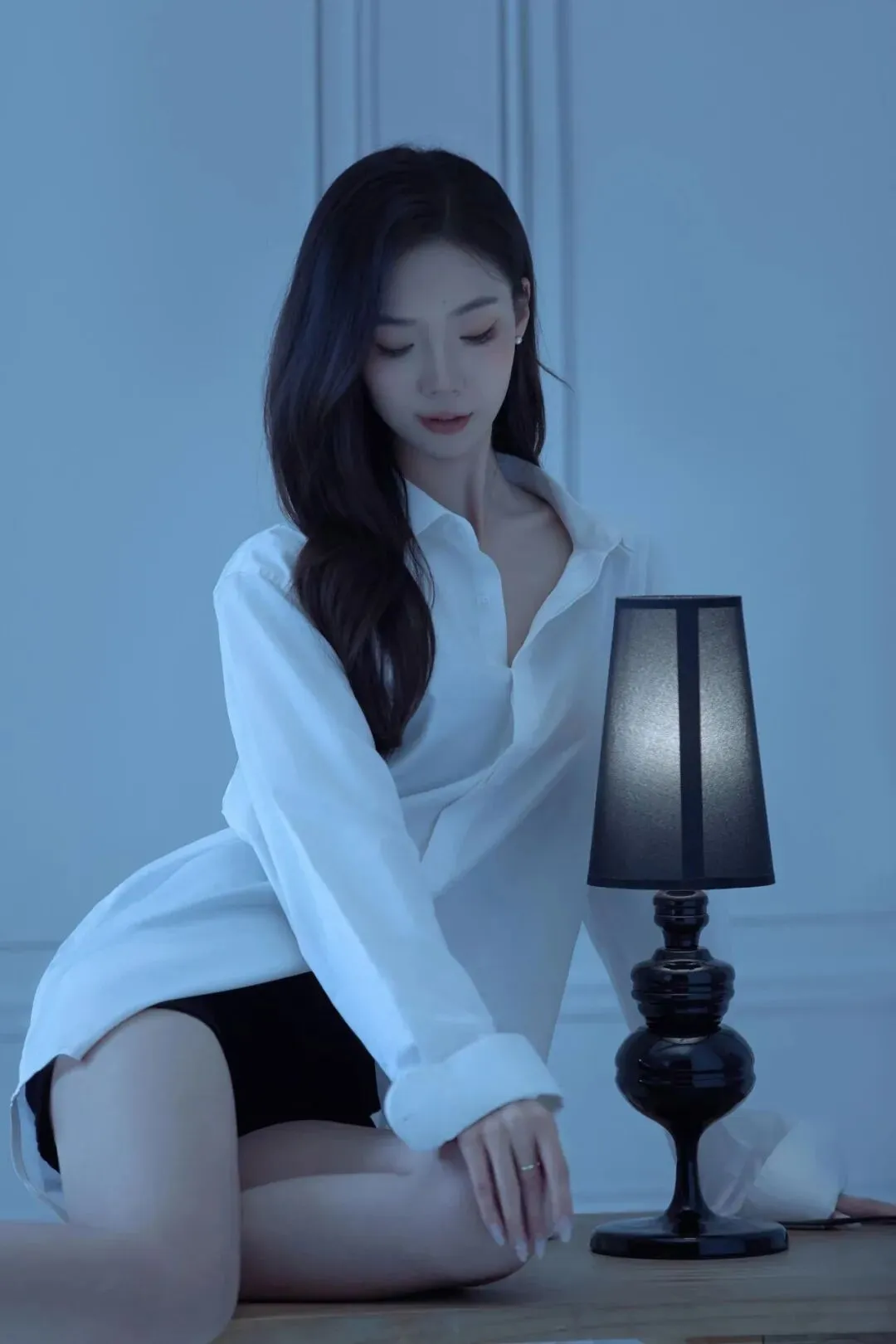 双膝跪坐在桌面上,身体向前倾,双手自然垂在腿间,眼睛向下看。这个动作会弱化刻意感,像刚整理完裙摆准备起身,台灯的光从前方打过来,能柔和地勾勒出肩颈线条。