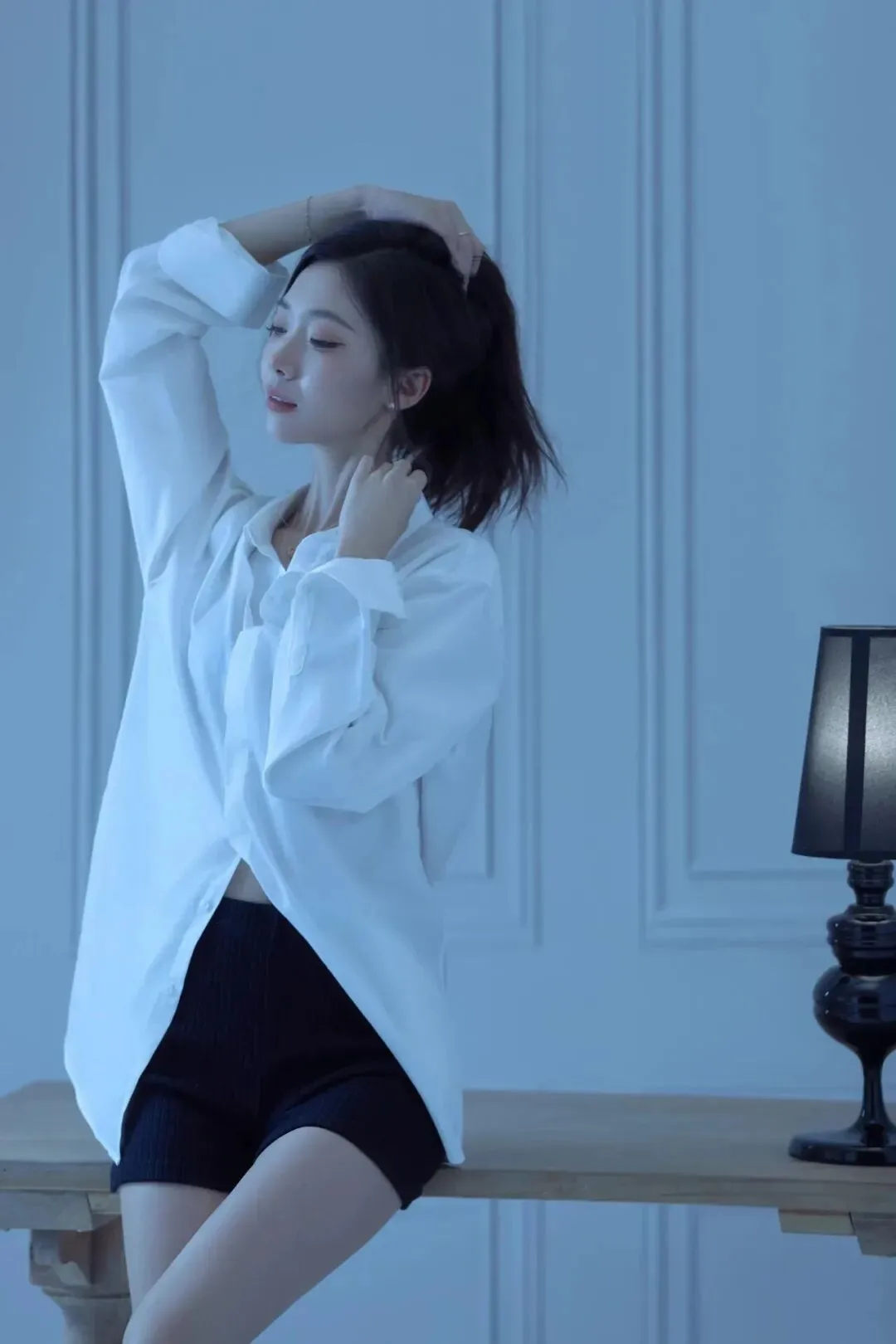 身体站直,双手撑在桌面两侧,一条腿向前微屈、脚尖点地,另一条腿向后轻抬。这个姿势会拉长身体线条,冷调的环境光让白衬衫和黑色短裤的对比更鲜明,显得利落又有张力。