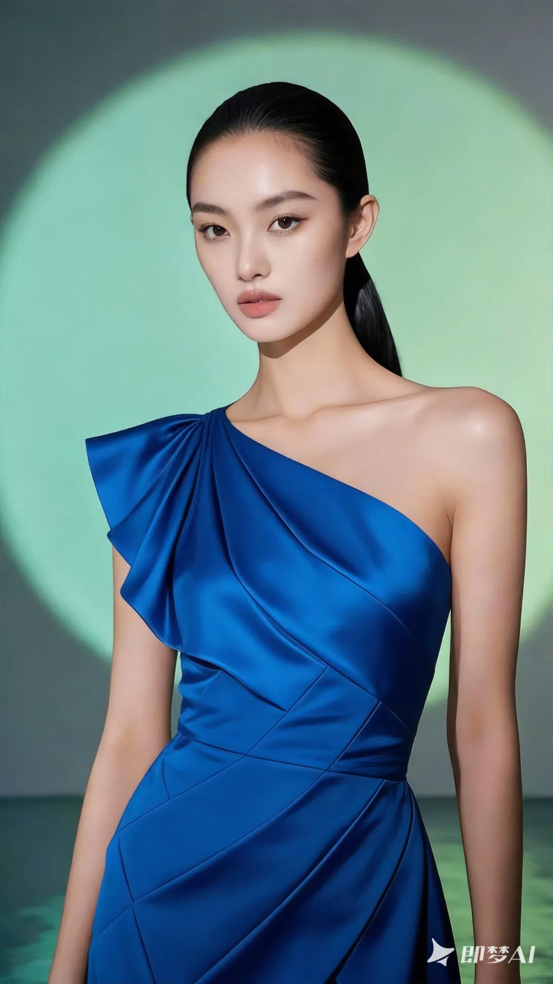 将模特身上的服装替换为【蓝色连衣裙】,保持模特脸部特征、发型、身材比例、站姿、镜头距离完全一致;电商棚拍光影,背景干净;面料真实有垂坠感,细节清晰,高分辨率