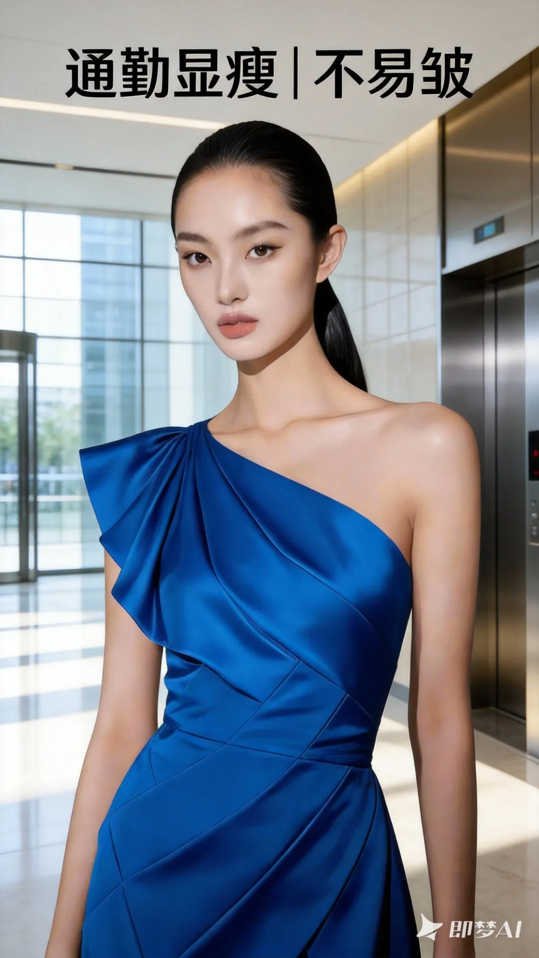 将背景替换为写字楼电梯口,干净明亮的商业空间,光影自然;保持模特人物与服装不变,真实拍摄质感 输出比例 9:16,用于信息流投放 在画面上方添加卖点文字:通勤显瘦|不易皱,排版简洁,文字清晰易读