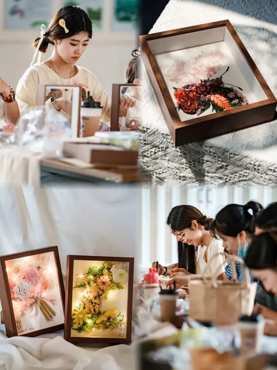 核心体验:用干花、宝石、珠子等材料规划好如何填充蝴蝶样式的背景,逐一粘贴固定后晾干,装进素色木制相框中制成专属的相框摆件。将易逝的美丽恒久封存,领悟温柔与坚韧共生的生命诗意。