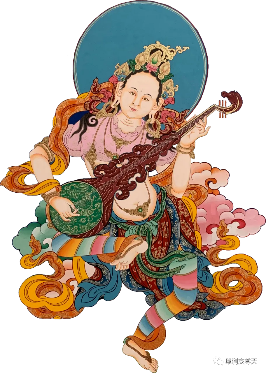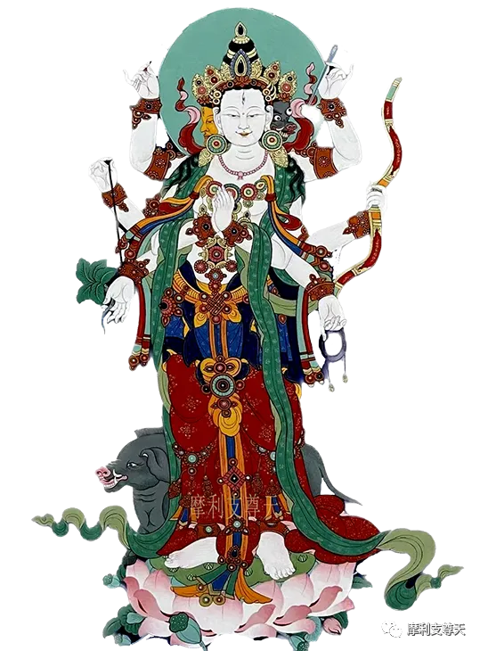 吉祥天母又称吉祥天女,梵音译拉克希米,藏语称班达拉姆,主要译名有功德天女、财宝天女、宝藏天女等,是婆罗门教的幸福与财富女神。吉祥天女的形象通常是一位美丽的女郎,有四只手臂(有时两只),两手持红色莲花(象征吉祥),两手抛洒金钱(象征财富),身边有数只白象(通常为一对)相随。