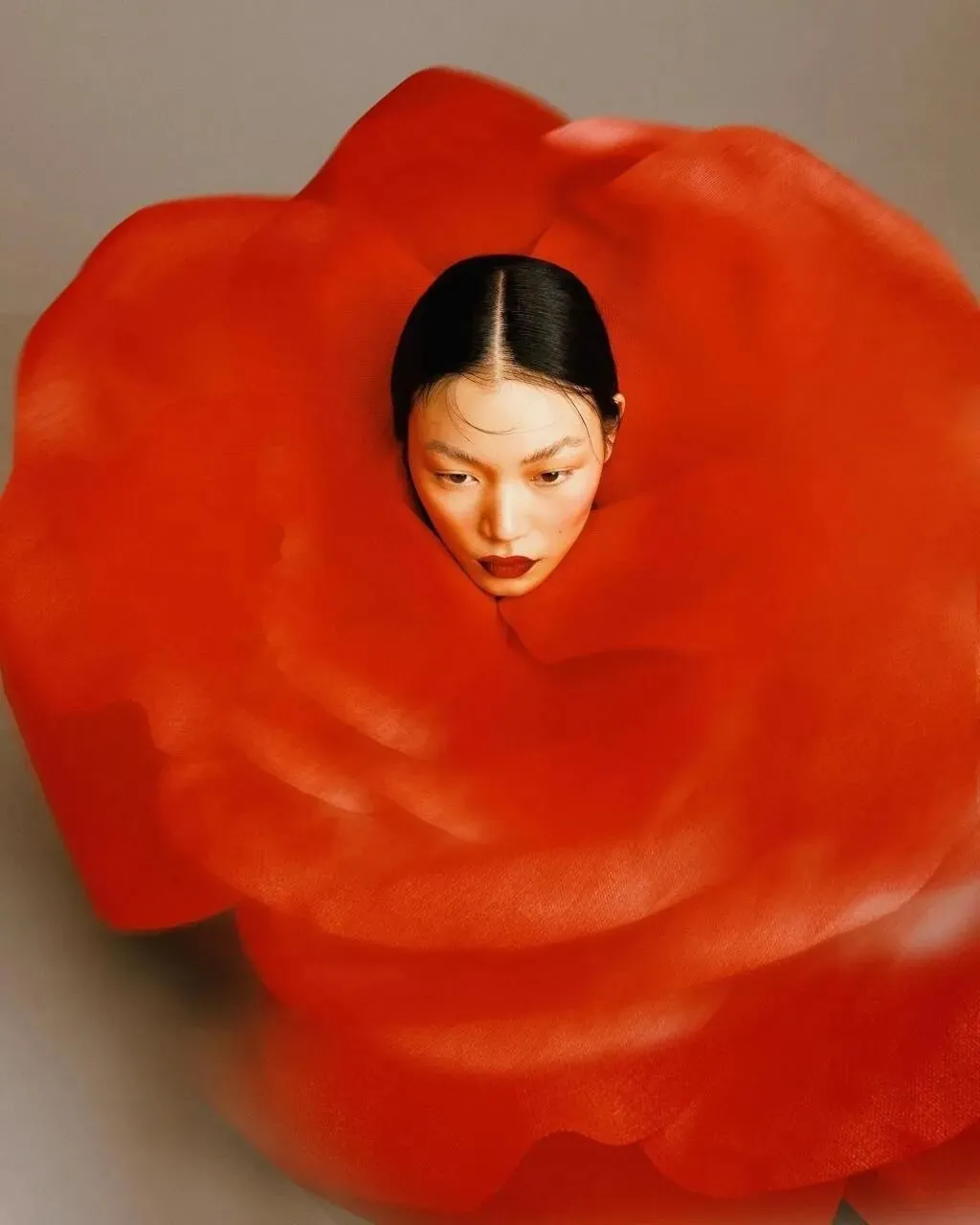 去年她为某时尚杂志拍摄的一组大片,灵感便来自《布达佩斯大饭店》:低饱和的马卡龙色系、对称构图、道具的微型化处理,连模特的肢体语言都带着韦斯·安德森式的“克制幽默”。这组照片发布后,评论区有人调侃:“以为是电影截图,结果是钟灵的新作——她把电影拍成了‘可触摸的照片’。”