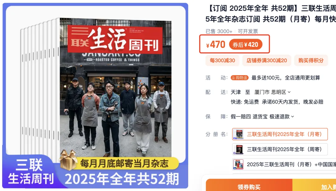 目前三联全年订阅售价,官方也要420元